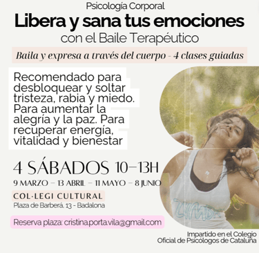 El baile y la expresión corporal libre es un tipo de actividad que pocos psicólogos ofrecen aún, aunque cada vez hay más adeptos porque las neurociencias están demostrando que el cuerpo habla continuamente con el cerebro, es una comunicación bidireccional. De hecho, estoy impartiendo estas enseñanzas a mis compañeros de profesión en el Colegio Oficial de Psicología de Cataluña (COPC).
