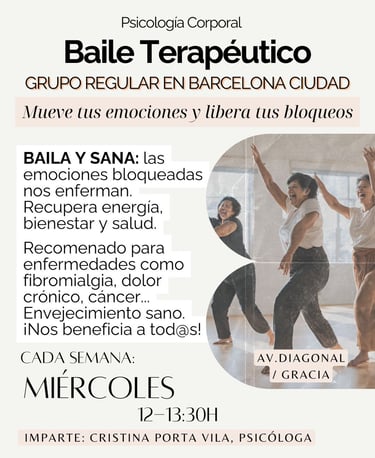 ¿Qué es el Baile Terapéutico? Es una rama de la Psicología Corporal que aborda la gestión de las emociones a través del cuerpo: danza emocional, respiración, postura y meditación en movimiento.